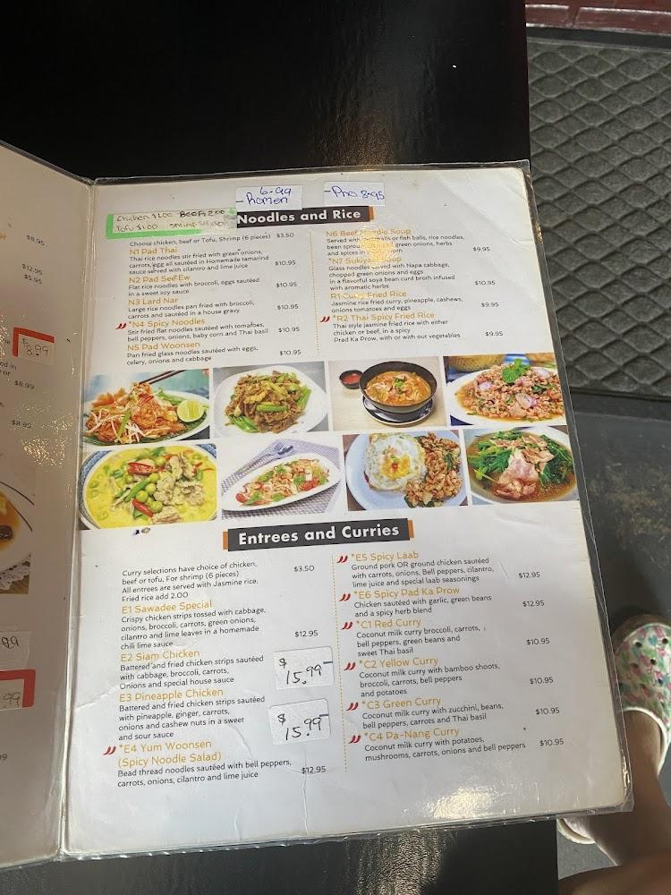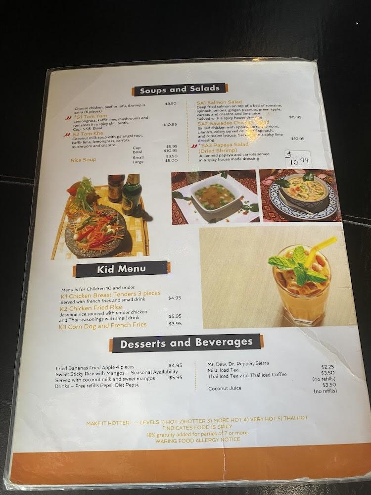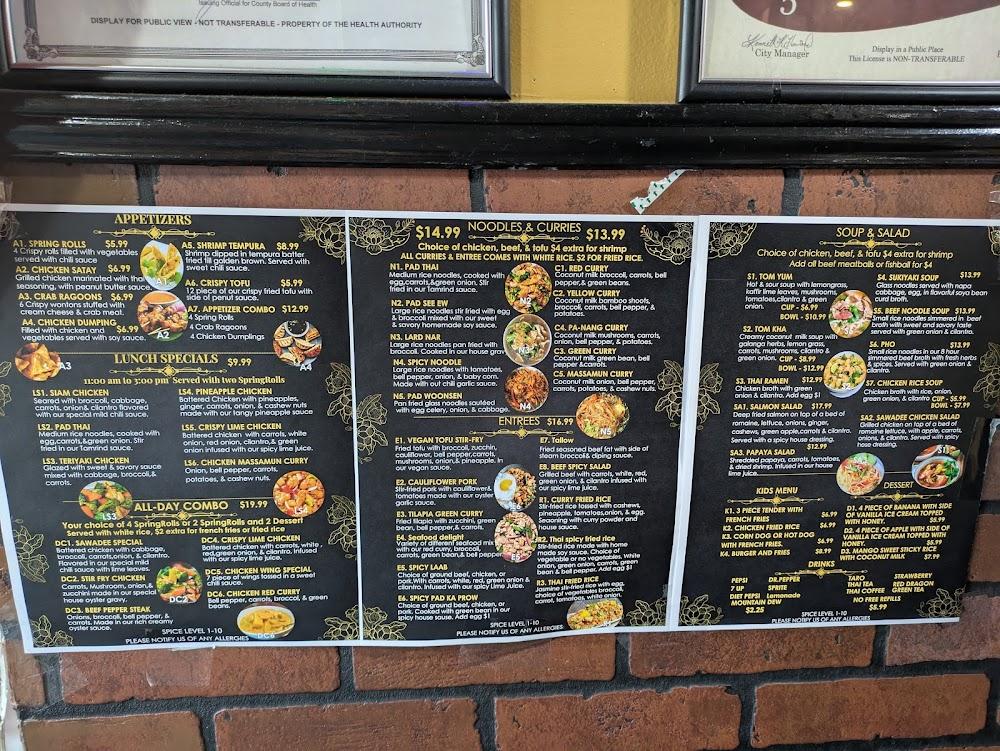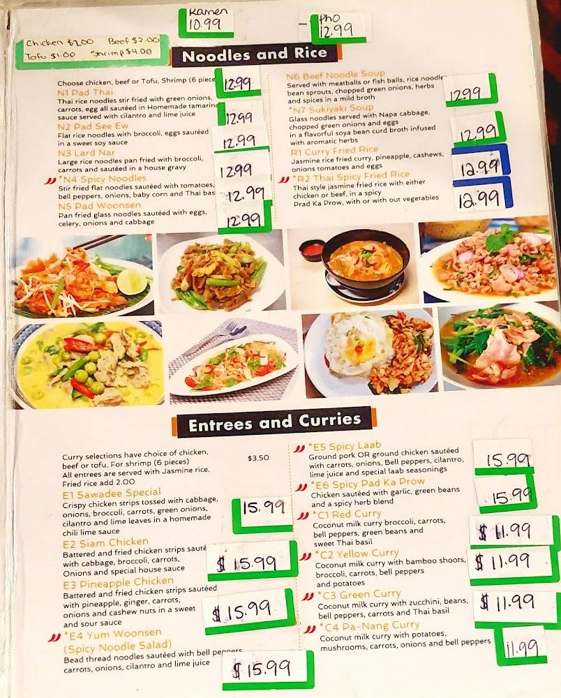 Noodles & curries take center stage, with favorites like Pad Thai and red curry standing out. Vegetarian options, salads, and delightful desserts complete the selection. Prices are reasonable, ranging from $10 to $20, ensuring a satisfying meal for all.